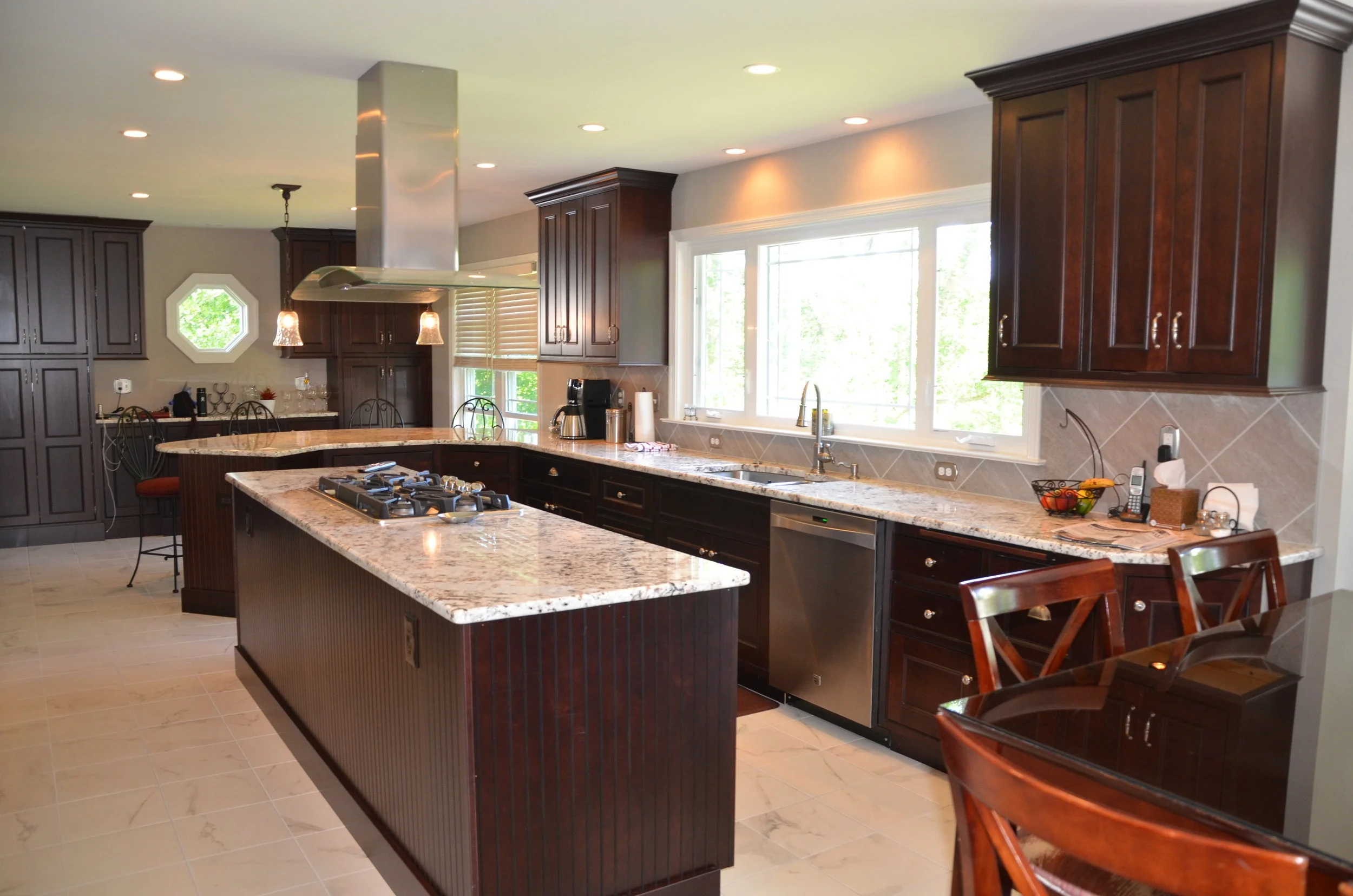 An Italian family, with a love of cooking and hosting large family gatherings was the main focus for this beautiful open design. To create more space, we removed a wall, and added a custom curved peninsula with seeded glass pendants and hand wrought iron hardware. The dark rich tone cabinets are complemented by gorgeous, spacious granite countertops and Carrera flooring. The backsplash is comprised of a large handsome variegated tile with both light gray and warm brown tones to accent the cabinetry, counter, and flooring. The custom island includes a cooktop stove with a sleek Italian hood, adding space for their cooking and entertaining. The original kitchen window was replaced with a large triple casement window, while an additional octagon window was added to add extra light and maintain their Italian flare. This amazing space was finished with a soft gray paint to pull together all of the rich Italian tones.