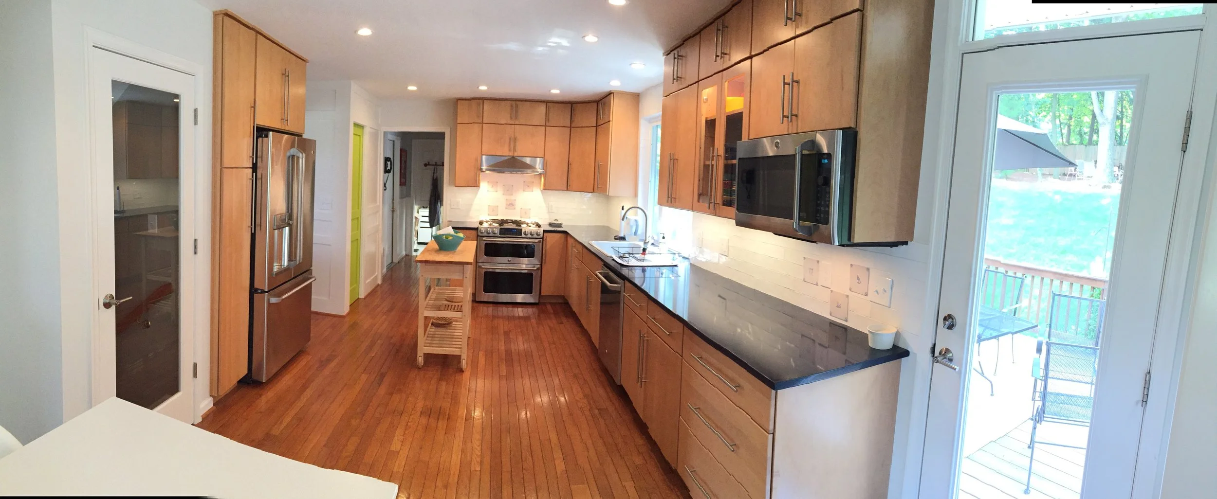 With two growing boys, this family of four, had quickly outgrown their kitchen! By relocating the refrigerator and the microwave, we were able to provide them with additional cabinet storage and a walk-in pantry, while also providing a functional oven hood. The pantry included open shelving and additional counterspace.